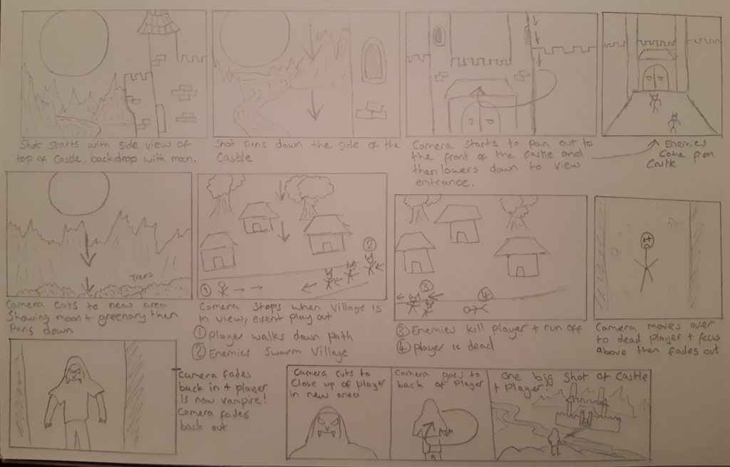 - Last of all was to create a trailer for the game (shown at the top of the page). Here is a storyboard sketch showing the concept: