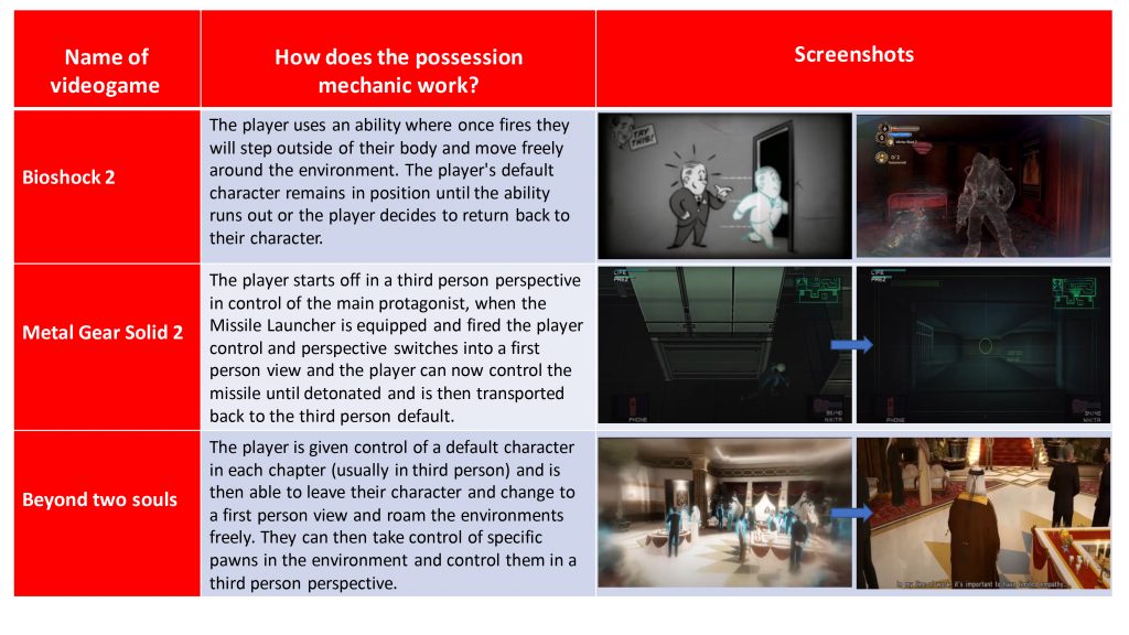- I began by researching possession mechanics found in other games such as Bioshock 2, Metal Gear Solid 2 and Beyond Two Souls: