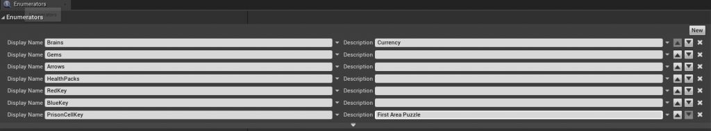 - Next I created an enumeration and added a few test items. Some of which I used in my game, these were Brains (a pickup that will count as currency to progress) and the prison cell key mentioned above in the scenarios: