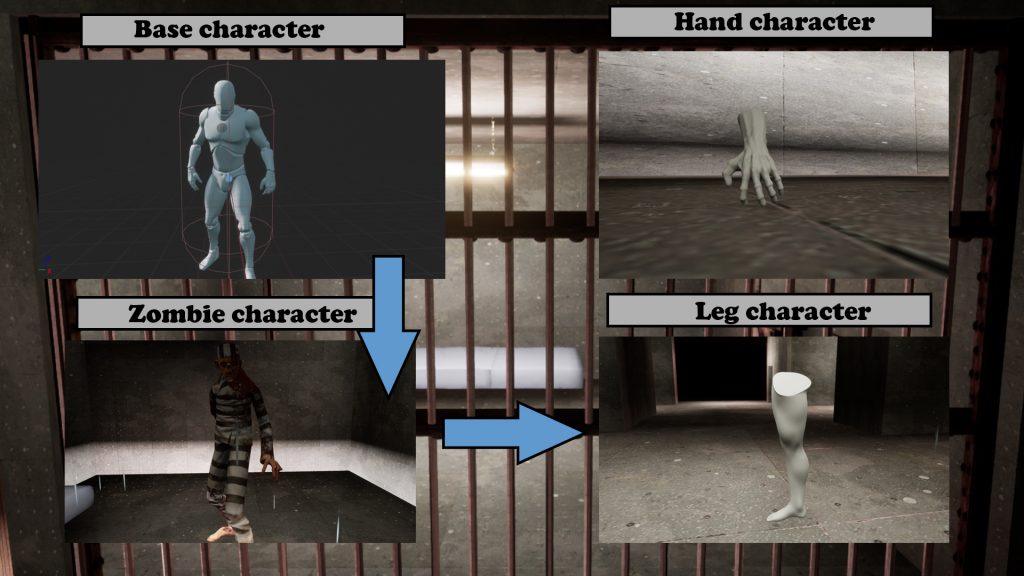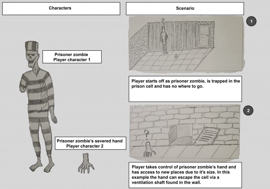 The game will be centred around escaping from a prison. The player will play as a prisoner now Zombie who has a conveniently severed hand and/or leg to help him escape the prison. This is where the possession mechanics will come into play. The player will switch between the zombie and the zombies hand to solve puzzles and collect items to progress. This is where an inventory system will come into effect. An example would be collecting a key to open a door which allows the zombie to pass through. Though the key is only accessible by playing as the hand: