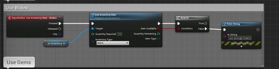 - I then added an inventory system to my Base character via components and created two child actors from the zombie and severed hand characters. Next I created blueprint pickups to interact with this inventory and made key inputs to “use” the amounts in the inventory for both characters: