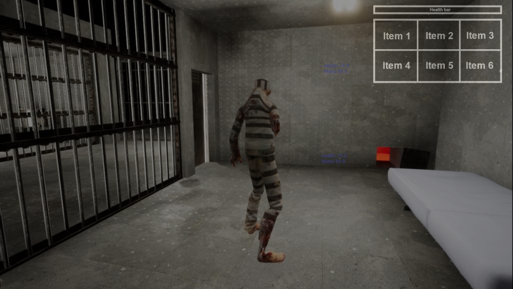 - Once the inventory had been set up and tested I began to sketch out a wireframe for the HUD system. The idea was there would always be a health bar in the top right that would indicate how much health the player has. There would also be an inventory that would appear below the health bar via an action key input (this could be toggled on and off), the game did not stop while this was viewed it was just there as a reminder to the player what was in their inventory and the quantity of the item/items collected. In concept there would be six slots to store items inside that the player would need to escape from the prison: