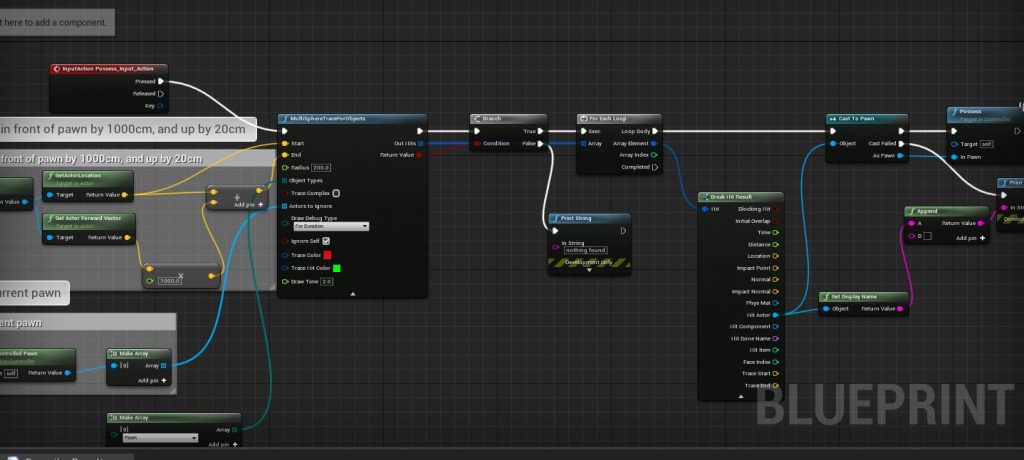 - I created an action input so the player could possess another pawn by presses left shift. I then created a sphere trace to detect pawns within the area and possess them if they are within range: