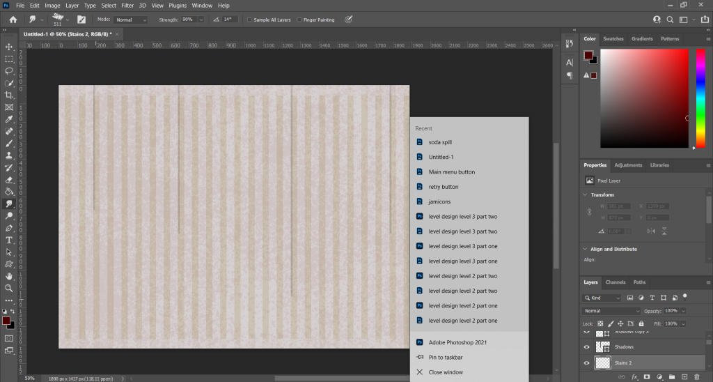 This is where I started to create the textures for the room, starting with the tile set. I took a lot of inspiration from Silent Hill 3 and it’s textures, I wanted to make sure the blood looked like blood so added in orange colours then smeared them into the red to create the look shown below. The blacks and greys were to show a mould like effect, I used special shapes and multiple layers to create the “grime”.