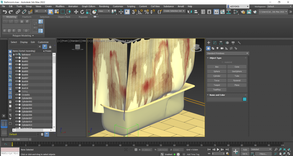 From the sink I moved to the toilet. Again this involved making lots of different parts and then merging them together. I slightly moved the water tank lid as to not make the objects too “perfect” as the scene was going to be a destroyed bathroom. It was difficult to find the correct balance but there were a few objects I bent and moved to give this effect.